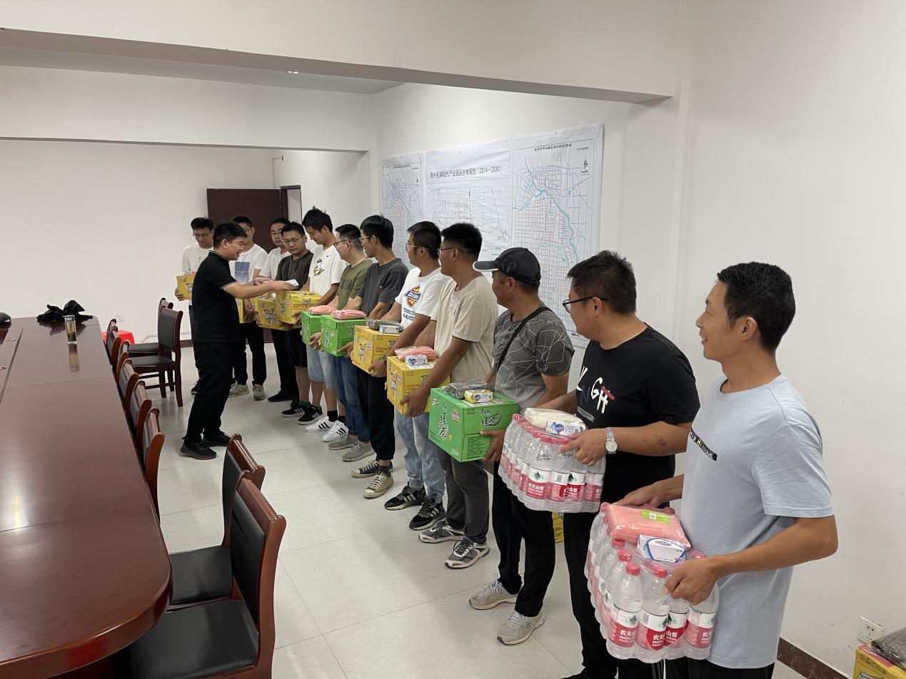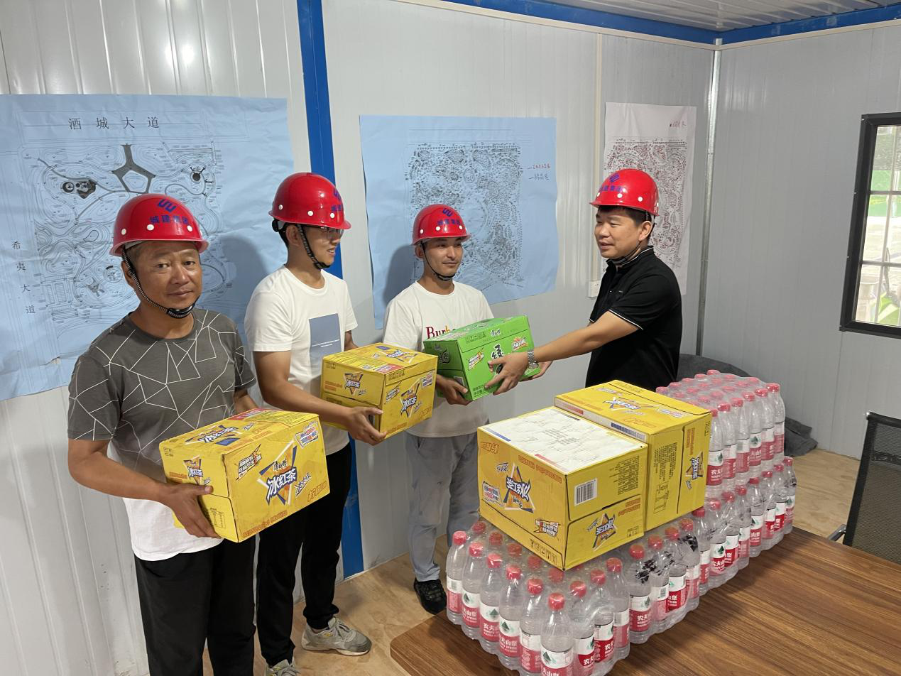 大力推進工程進度的同時楊總交代大家,現階段亳州降雨量不大,氣溫更是從五月份開始就居高不下,現場作業(yè)難度陡升,我們要克服萬難,不怕艱辛,在不落工程進度的同時一定也要保障施工人員的安全。除了依照上級領導要求的佩戴質量好的安全頭盔和買好人身保險以外,更應該考慮到酷熱天氣給基層人員帶來的不便及危險,楊總在傳達了集團領導的指示精神后,冒著來之不易的大雨,帶著清涼飲品先后去往養(yǎng)護、亳蕪公園以及醫(yī)療器械產業(yè)園等項目,親自為各個項目送去一箱箱茶水飲料,將集團的關懷送到施工現場,送到基層工作人員的身邊。