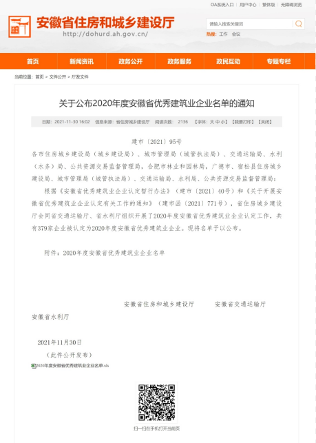 喜訊!城建集團榮獲“2020年度安徽省優(yōu)秀建筑業(yè)企業(yè)”