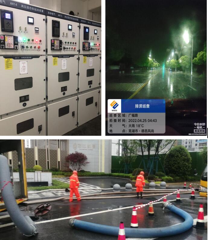 “21點(diǎn)21分,請(qǐng)各路段排澇應(yīng)急責(zé)任人,做好上路巡查準(zhǔn)備。”“22點(diǎn)28分,弋江泵站,夜間開機(jī)排水。騰空前池水位,為突發(fā)降雨做準(zhǔn)備!”“凌晨3點(diǎn)40分,桂花橋泵站開機(jī)排水。”“凌晨4點(diǎn)47分,政通公司巡查廣福路,路面無積水,通行正常。”“凌晨5點(diǎn)01分,汀海壹品,公交站牌,已積水,有人員值守,泵車正在助排。”“凌晨5點(diǎn)02分,政通公司巡查銀湖北路,天門山路站路面存在積水,已安排隊(duì)伍排水,保證路面正常通行。”“凌晨6點(diǎn)13分,排澇泵車汀海壹品段排水中,路面積水已下降不少,持續(xù)關(guān)注中。”……2022年4月24日晚,蕪湖城區(qū)再次遭遇暴雨夜襲,城建集團(tuán)工作群里防汛信息頻繁閃爍,而這些信息背后,正是一個(gè)個(gè)堅(jiān)守奮戰(zhàn)在雨夜中的城建集團(tuán)員工。艱難的疫情防控阻擊戰(zhàn)剛剛?cè)〉秒A段性勝利,城建集團(tuán)的員工們還未來得及體會(huì)來之不易的自由,便又開始投入到緊張的防汛工作中。