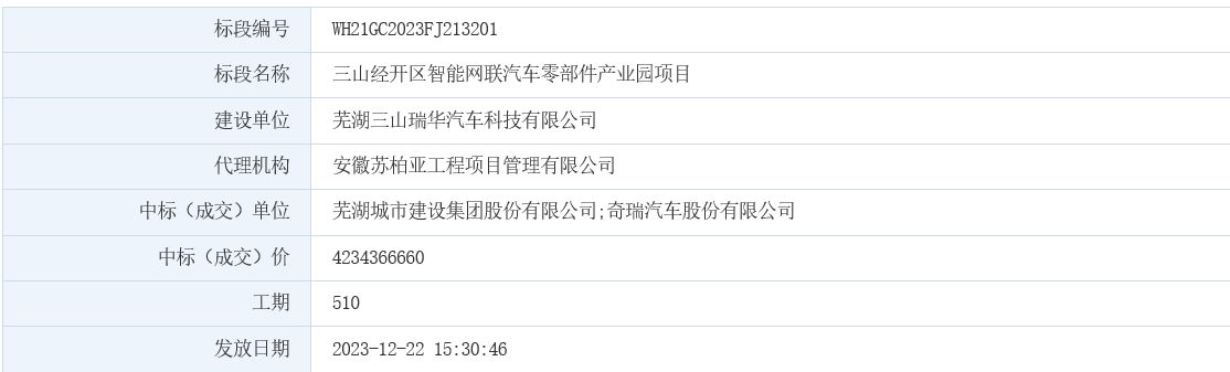 三山經開區(qū)智能網聯(lián)汽車零部件產業(yè)園項目位于三山經濟開發(fā)區(qū),地塊北至疏港路、西至橫山河路、南至長江南路,占地1620畝,主體包含1號聯(lián)合廠房、2號車間、3號車間及其配套工程的建設施工,生產生活設備的采購安裝調試等工程。該項目是蕪湖城市建設集團股份有限公司與奇瑞汽車股份有限公司以聯(lián)合體形式于2023年12月22日中標的項目,中標金額達42.3億元!