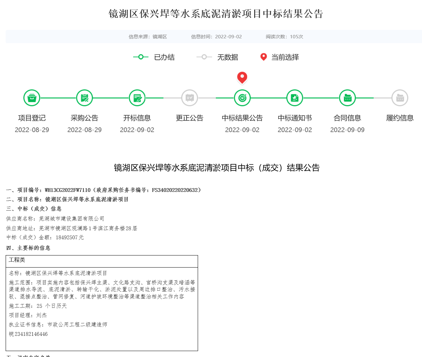 一分耕耘,一分收獲。9月,集團(tuán)公司中標(biāo)了鏡湖區(qū)保興垾等水系底泥清淤項(xiàng)目,中標(biāo)額1849.25萬元。