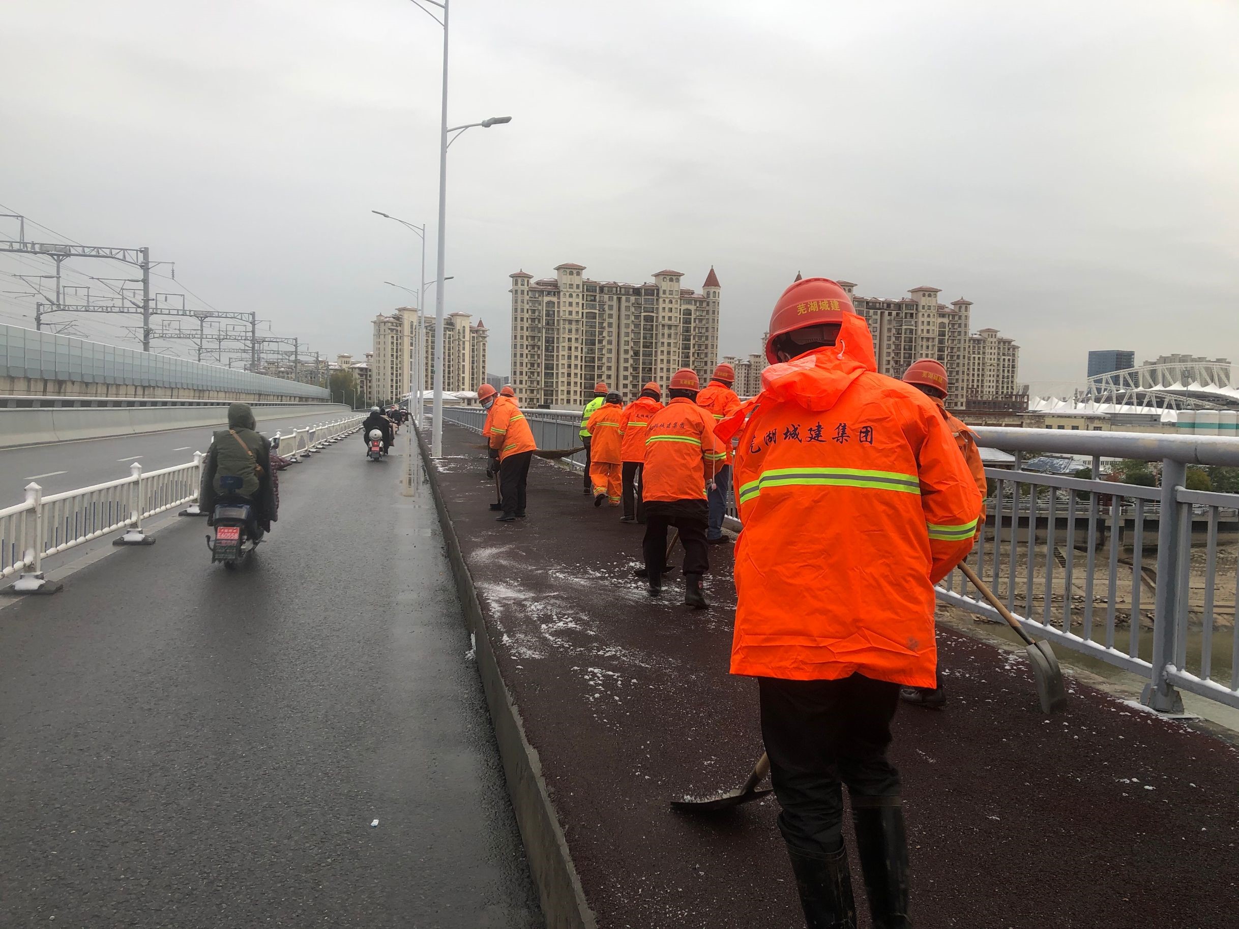 為認(rèn)真落實(shí)省市防范應(yīng)對(duì)雨雪冰凍災(zāi)害決策部署,扎實(shí)做好全市城管系統(tǒng)應(yīng)急掃雪除冰工作,保障城市道路通暢,保證行人通行安全,城建集團(tuán)立即啟動(dòng)除雪防災(zāi)應(yīng)急預(yù)案,共組織勞動(dòng)力約200人,機(jī)械設(shè)備40多輛投入除雪防災(zāi)工作,第一時(shí)間對(duì)全市高架橋、人行天橋和下穿橋等區(qū)域進(jìn)行巡查,對(duì)重點(diǎn)的10座大型橋梁拋撒工業(yè)鹽、尿素共6噸,使用多功能除雪車對(duì)臨江橋、中江橋、倉(cāng)津橋等進(jìn)行除冰鏟雪,并對(duì)沃爾瑪天橋、花津南路天橋等6座人行天橋進(jìn)行人工清掃,為來(lái)往行人開(kāi)辟了一條安全通暢的“愛(ài)心路”!
