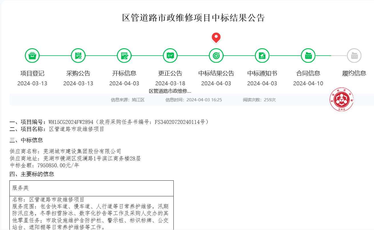 4月3日,蕪湖城建集團憑借豐富的養(yǎng)護經(jīng)驗和優(yōu)秀的綜合實力成功中標(biāo)鳩江區(qū)區(qū)管道路市政維修項目,中標(biāo)價795萬元/年,服務(wù)期三年,采用“1+1+1”養(yǎng)護模式,項目內(nèi)容包括所涉區(qū)塊的92條市管道路及附屬市政設(shè)施的日常養(yǎng)護維修和汛期防汛、冬季掃雪除冰等應(yīng)急工作。